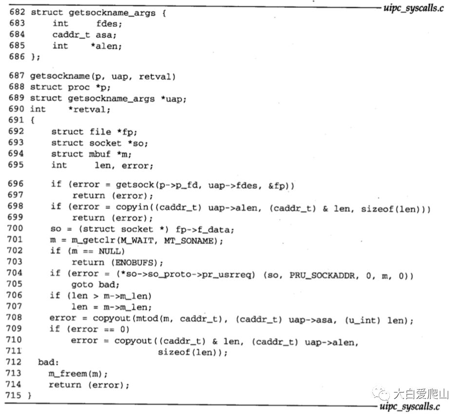 682~715 getsock返回描述符的file结构。将进程指定的缓存的长度赋值给len。这是我们第一次看到对m_getclr的调用:该函数分配一个标准mbuf,并调用bzero清零。当协议收到PRU_SOCKADDR请求时,协议处理层负责将本地地址存入m。