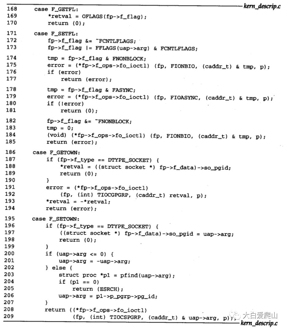 168~185 F_GETFL返回与描述符相关的当前文件状态标志,F_SETFL设置状态标志。通过调用fo_ioctl将FNONBLOCK和FASYNC的新设置传递给对应的插口,而插口的新设置是通过图19中描述的soo_ioctl函数来传递的。只有在第二个so_ioctl调用失败后,才第三次调用fo_ioctl。该调用的功能是清除FNONBLOCK标志,但是应该改为将这个标志恢复到原来的值。