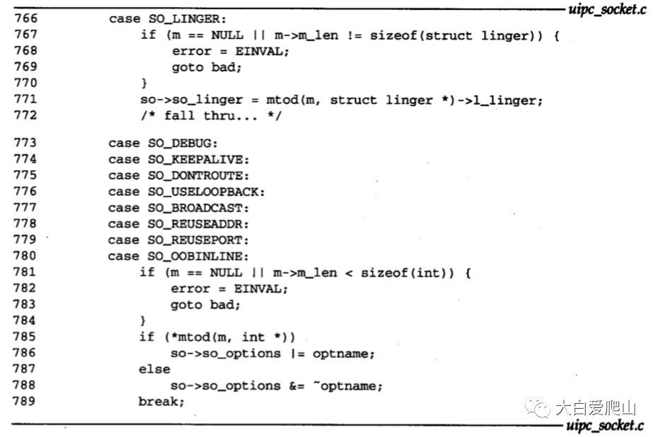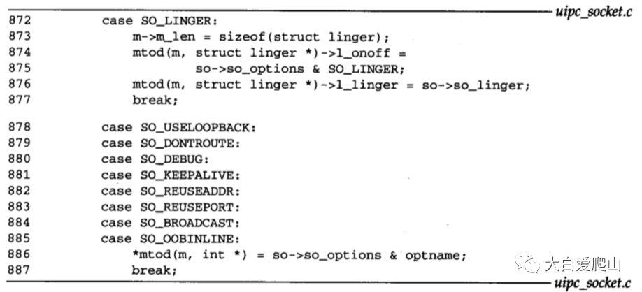 确保进程已传入长度为linger结构大小的数据后,将结构成员l_linger复制到so_linger中。在下一组case语句后决定是使能还是关闭该选项。so_linger和close系统在概说《TCP/IP详解 卷2》第15章 插口层已介绍过。