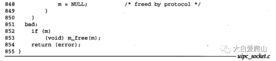 918~925 如果执行的是switch中的default情况下的语句,则释放mbuf,并返回ENOPROTOOPT。否则,switch语句执行完成后,将指向mbuf的指针赋给*mp。当函数返回后,getsockopt从该mbuf中将数据复制到进程提供的缓存,并释放mbuf。