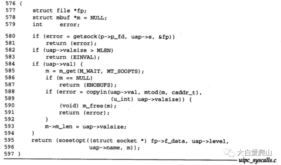 565~597 getsock返回插口描述符的file结构。如果val非空,则将valsize个字节的数据从进程复制到m_get分配的mbuf中。与选项对应的数据长度不能超过MLEN个字节,所以,如果valsize大于MLEN,则返回EINVAL。调用sosetopt,并返回其值。