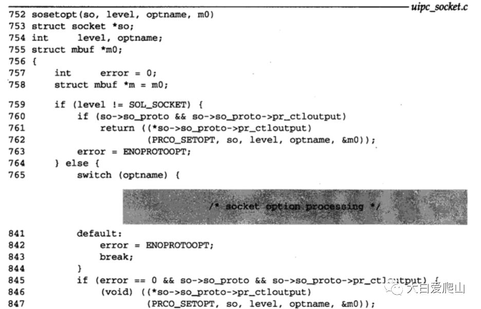 sosetopt函数处理所有插口级的选项,并将其它的选项传给与插口关联的协议的pr_ctloutput函数。图4列出了sosetopt函数的部分代码。