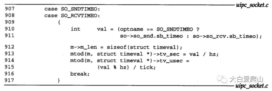907~917 将发送或接收缓存中的sb_timeo值赋给var。基于val中的时钟滴答数,在mbuf中构造一个timeval结构。