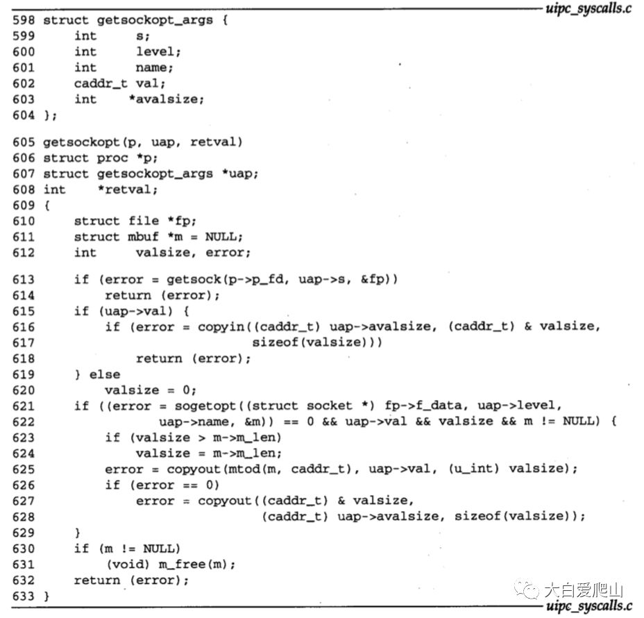 598~633 getsock获取插口的file结构,将选项缓存的大小复制到内核,调用sogetopt来获取选项的值。将sogetopt返回的数据复制到进程提供的缓存,可能还需要修改缓存长度。如果进程提供的缓存不够大,则返回的数据可能会被截掉。通常情况下,存储选项数据的mbuf在函数返回后被释放。