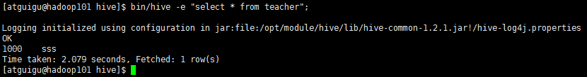 bin/hive -e "select * from teacher;"