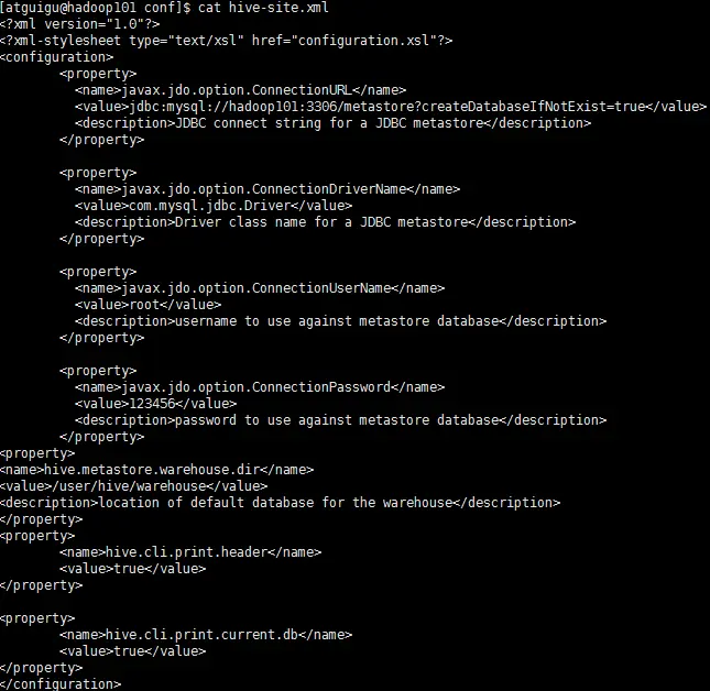 - 在hive-site.xml文件中添加如下配置信息,就可以实现显示当前数据库,以及查询表的头信息配置