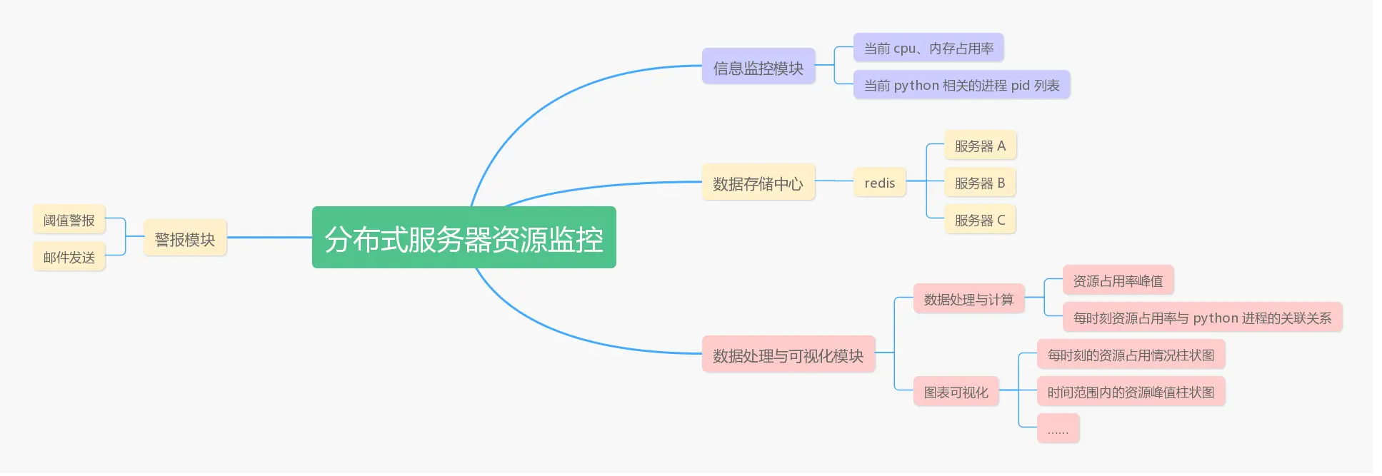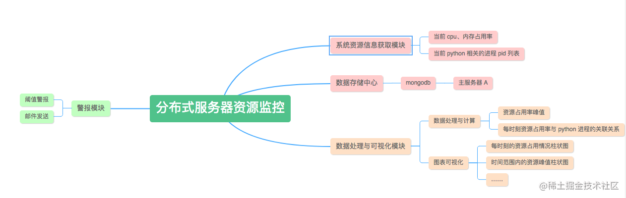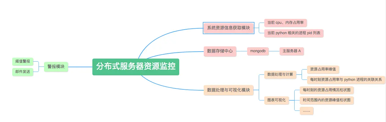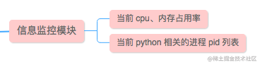 首先,这个模块完成的任务是获取服务器资源信息,包括当前 cpu、内存和磁盘的占用率以及当前 python (因为爬虫是 python 编写的,所以监控 python 进程信息)相关进程的列表,它的名字似乎不太合适,应该改为 系统资源信息获取模块。