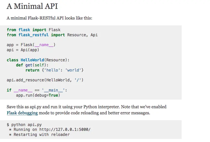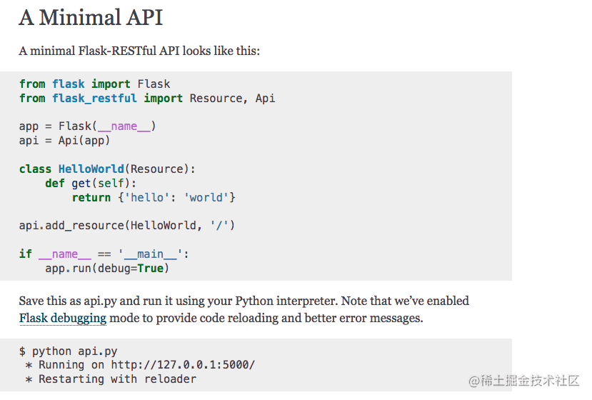 Flask restful 文档中的 快速开始 部分,给出了一个简单的示例代码,我们可以通过这段代码来启动 Flask。当然 奎因 从来都不会这么做,因为直接复制粘贴文档是不可能快速学习的,必须立即将文档转为自己的知识: