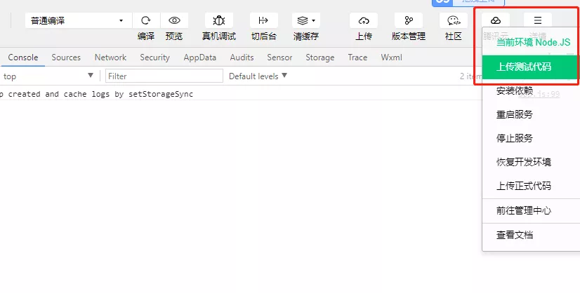 在这个阶段里,微信开发者工具占据着很大的优势,它可以统一管理所有代码的开发与部署。因为现在是要开通测试环境,因此选择测试代码上传腾讯云后台即可。