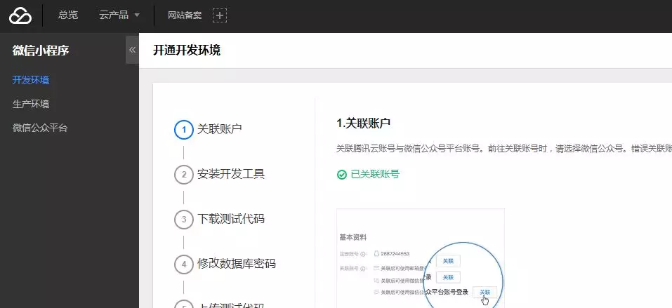 测试环境,亦即腾讯云后台的开发环境。它的开通分为两个部分,申请测试号与代码部署。申请测试号的步骤就不多说了,直接搜索测试号进行按照步骤进行注册即可。重点来关注下开发环境是如何开通的。