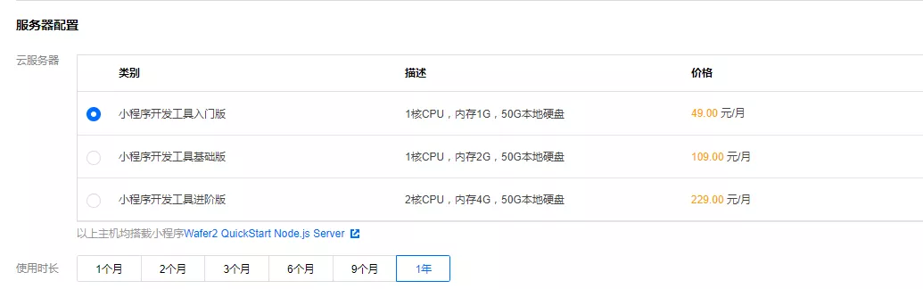 在服务器配置上选择自己需要的服务器,个人开发的话,我们可以选择一个最便宜的服务器就好。