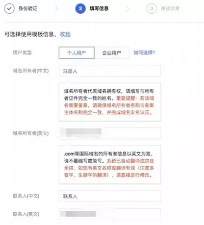 提交完成之后,我们要进行提供域名的实名认证了。注册人、联系人等需要填写的信息都填好就可以了。