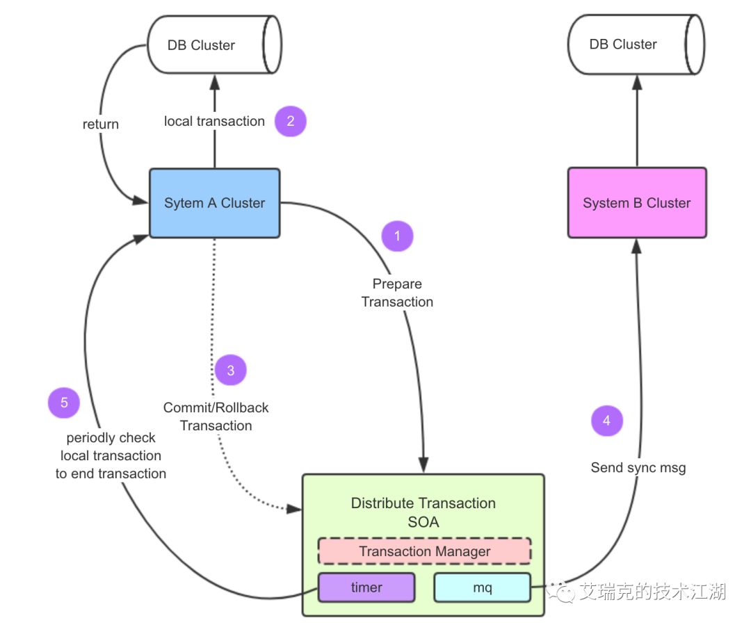 整个模型可以不恰当得描述为:农行扣了100元后,发送“已经扣款”的消息给招行,招行收到消息,知道农行扣款成功了,然后在招行账户上加100元。