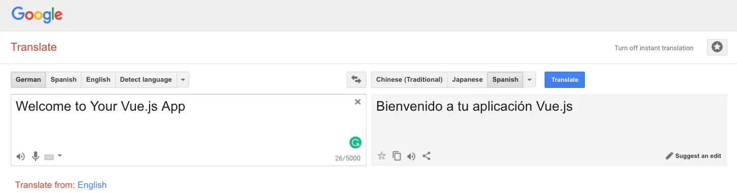 const messages = { 'en': { welcomeMsg: 'Welcome to Your Vue.js App' }, 'es': {}};Now we have to provide a Spanish translation for this phrase. Since I do not speak Spanish fluently, I am going to use Google Translate.
