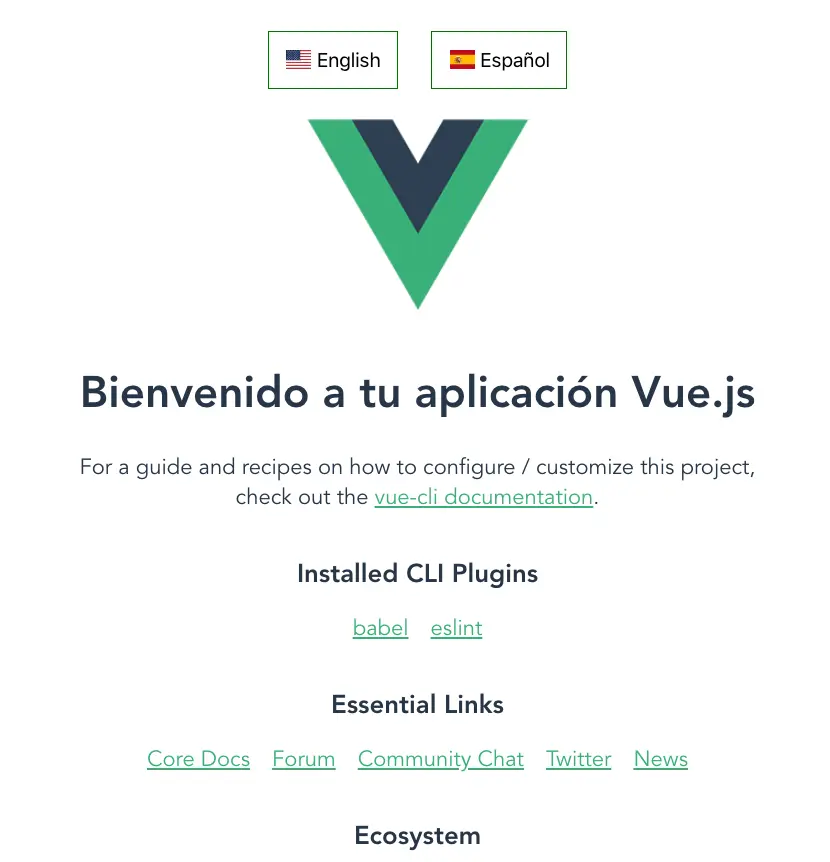 <template> <div class="hello"> <h1>{{ $t('welcomeMsg') }}</h1> <p> {{ $t('guide') }}<br> {{ $t('checkout') }} <a href="https://cli.vuejs.org" target="_blank" rel="noopener">vue-cli documentation</a>. </p> <h3>{{ $t('plugins') }}</h3> <ul> <li><a href="https://github.com/vuejs/vue-cli/tree/dev/packages/%40vue/cli-plugin-babel" target="_blank" rel="noopener">babel</a></li> <li><a href="https://github.com/vuejs/vue-cli/tree/dev/packages/%40vue/cli-plugin-eslint" target="_blank" rel="noopener">eslint</a></li> </ul> <h3>{{ $t('links') }}</h3> <ul> <li><a href="https://vuejs.org" target="_blank" rel="noopener">Core Docs</a></li> <li><a href="https://forum.vuejs.org" target="_blank" rel="noopener">Forum</a></li> <li><a href="https://chat.vuejs.org" target="_blank" rel="noopener">Community Chat</a></li> <li><a href="https://twitter.com/vuejs" target="_blank" rel="noopener">Twitter</a></li> <li><a href="https://news.vuejs.org" target="_blank" rel="noopener">News</a></li> </ul> <h3>{{ $t('ecosystem') }}</h3> <ul> <li><a href="https://router.vuejs.org" target="_blank" rel="noopener">vue-router</a></li> <li><a href="https://vuex.vuejs.org" target="_blank" rel="noopener">vuex</a></li> <li><a href="https://github.com/vuejs/vue-devtools#vue-devtools" target="_blank" rel="noopener">vue-devtools</a></li> <li><a href="https://vue-loader.vuejs.org" target="_blank" rel="noopener">vue-loader</a></li> <li><a href="https://github.com/vuejs/awesome-vue" target="_blank" rel="noopener">awesome-vue</a></li> </ul> </div></template>Start your server and view your application in the browser. Click between the two buttons. You will see the text automatically translate to the language you clicked. Watch this gif.