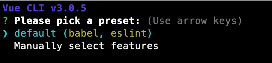 vue create vue-internationalizationThe Vue CLI will prompt you to pick a preset. You have the option of selecting the default preset or manually selecting features. I chose default.