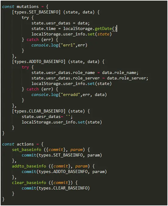 存储基础信息,将传入的data赋值给state.user_datas,然后将state存入localStorage.user_info。