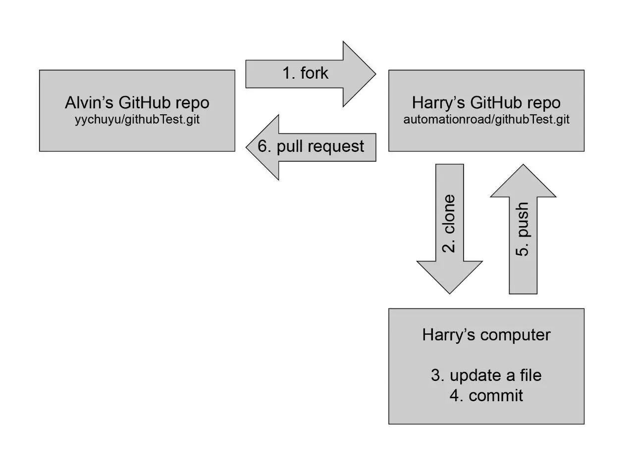现在Harry看到了这个项目,想要对它进行贡献代码。想要达到这个目的,Harry要完成下图的这些步骤: