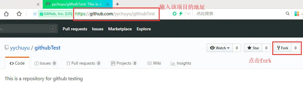 Harry在找到这个项目之后,点击右上角的「fork」按钮。稍等片刻后,就会在Harry的账号下克隆了一个一样的项目githubTest,包括文件,提交历史,issues,和其余一些东西。