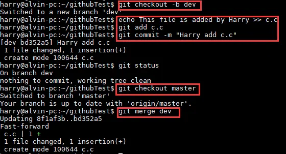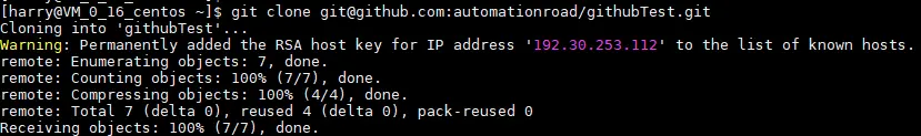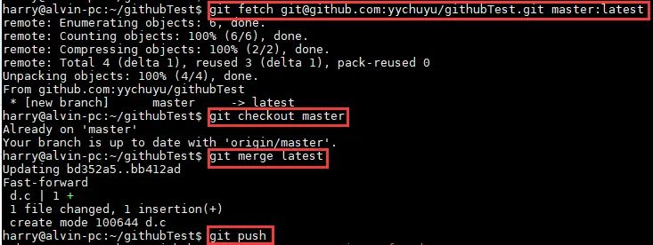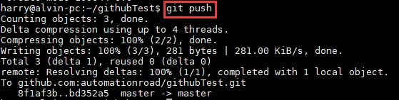 现在,Harry电脑上的代码与原项目代码保持同步了。我们再使用git push命令,就可以将最新代码推到Harry账号下githubTest项目里