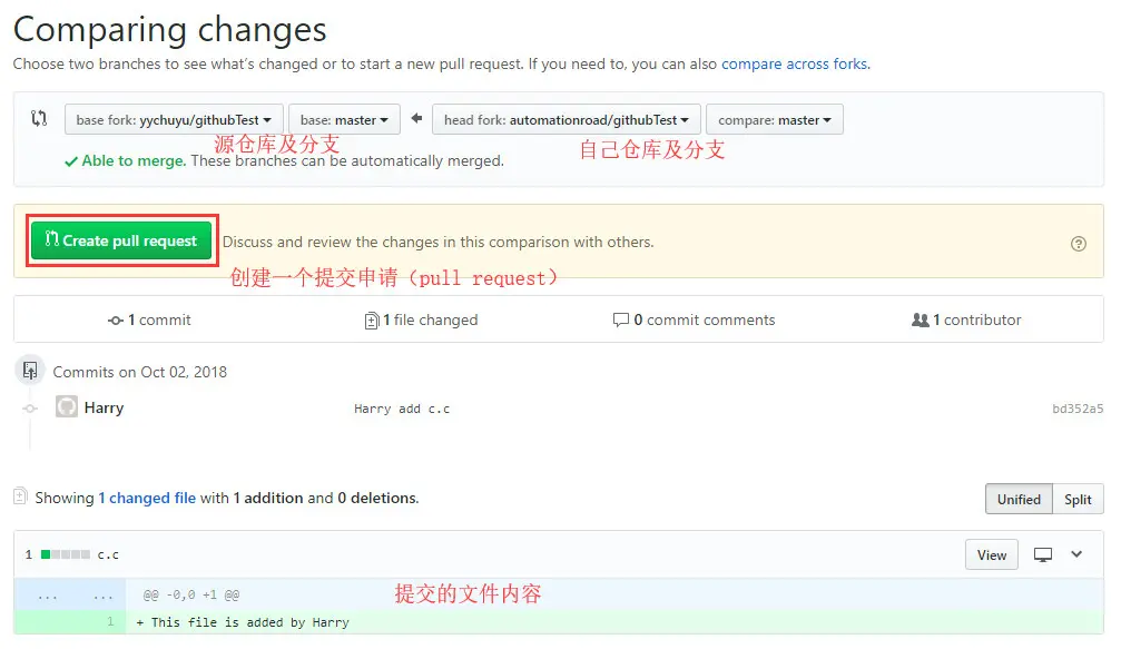 之后,gitHub会自动对源仓库分支及自己仓库分支代码进行比对,看看是否有冲突。如果它显示「Able to merge」的话,Harry就可以点击下面的「Create pull request」绿色按钮,进行代码提交。