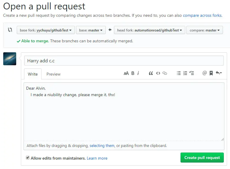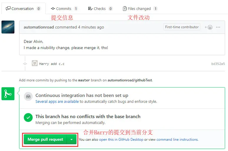 通过以上6步,原作者Alvin就会收到一个pull request,如下图: