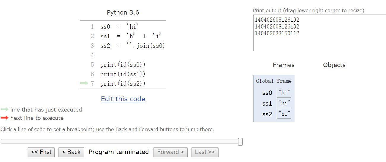 那就只能从 join 方法的实现原理入手查看了。经某交流群的小伙伴提醒,可以去 Python Tutor 网站,看看可视化执行过程。但是,很遗憾,也没看出什么底层机制。