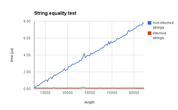 Intern 机制不会减少新对象的创建与销毁,但最终会节省出内存。这种机制还有另一个好处,即被 Interned 的相同字符串作比较时,几乎不花时间。实验数据如下(资料来源:t.cn/ELu9n7R):