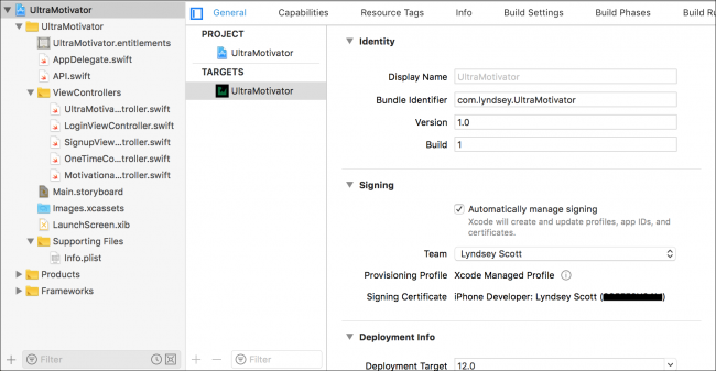 在Xcode中打开UltraMotivator,在左侧Project导航器的顶部选择目标,然后单击General选项卡。
