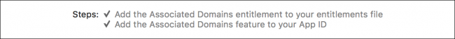 假设您已正确设置App ID’s capabilities,请在列出的域下方显示带有复选标记的标签。 这些复选标记表示您已将相关的域功能添加到您的entitlement file和app ID。