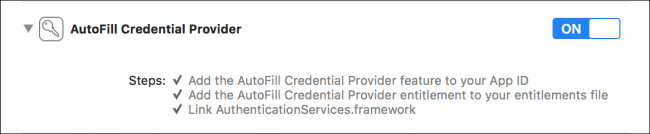 再次出现复选标记 - 这次,确认您已将自动填充凭据提供程序功能添加到App ID和entitlements file.中。 它还确认您已包含AuthenticationServices.framework。