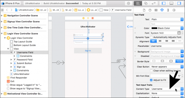 在Login view controller上选择Username field。 在右侧Inspector窗格中打开Attributes inspector选项卡。 找到Text Input Traits部分,并将Content Type设置为Username。