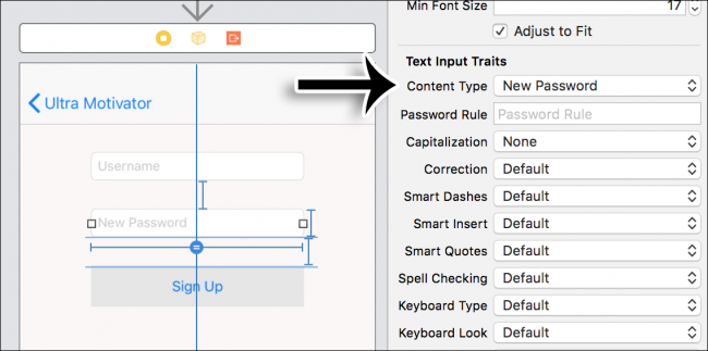 同样,在Signup view controller上,将Username field’s Content Type更改为Username。 然后,将New Password field的Content Type更改为New Password,以便此字段现在将自动填充强密码建议。