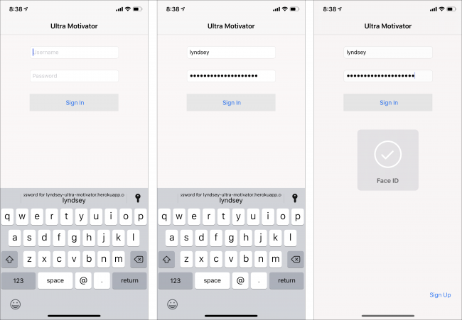 一旦您对您的凭据按预期保存感到满意,请返回到您的iOS设备并尝试登录该应用。 开始输入您的用户名。 您的用户名应自动显示在QuickType栏中,或者在您点击右侧的键符号后显示。 选择您的用户名,并在出现提示时使用Touch ID,Face ID或device passcode验证您的钥匙串访问权限。 您的iOS密码和用户名将相应地自动填充。