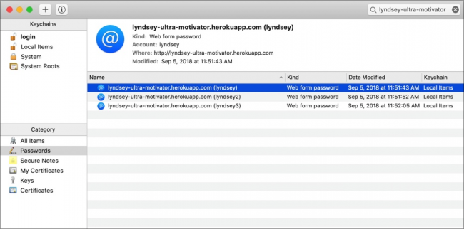 要确认您的iOS密码规则是否有效,请在iOS设备(而非模拟器)上运行该应用,然后使用几个不同的用户名进行注册。 在Mac上打开Keychain Access。 选择登login钥链,Passwords类别,然后搜索您的Web应用程序域的登录密码。