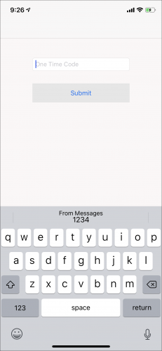 通过将textContentType设置为.oneTimeCode,每当iOS在用户正在查看此双因素身份验证屏幕时检测到传入邮件中的安全代码时,键盘上方的QuickType栏将自动填充代码。 然后,用户只需点击一下即可输入此代码,而无需离开应用程序。