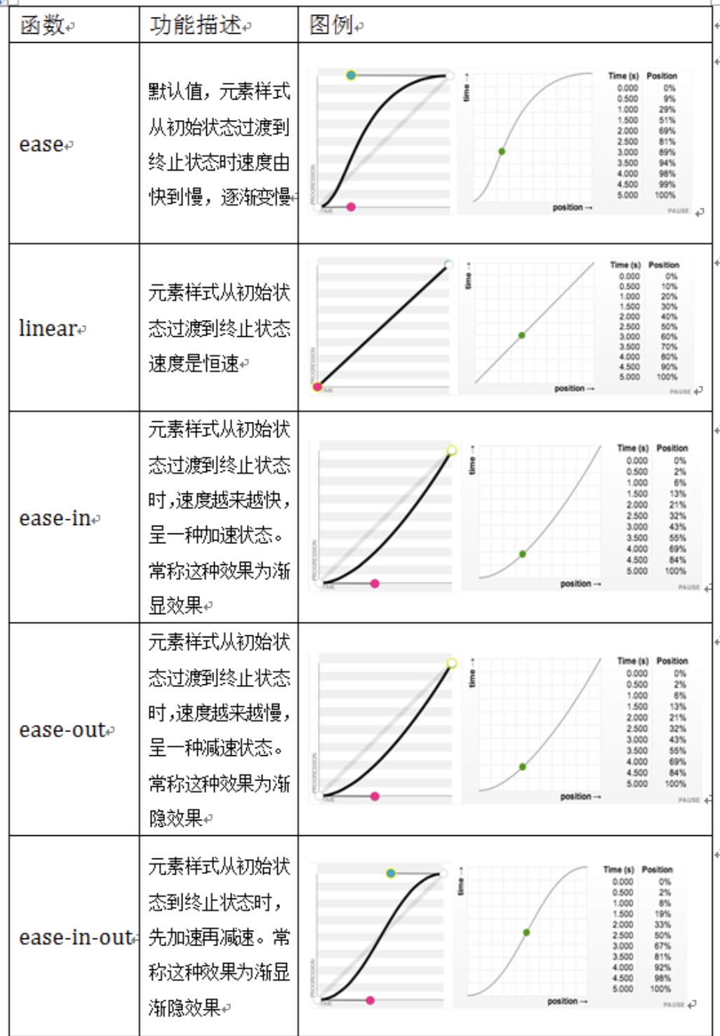transition-timing-function: 指定一个函数,定义属性值怎么变化。常用的函数有下面几个