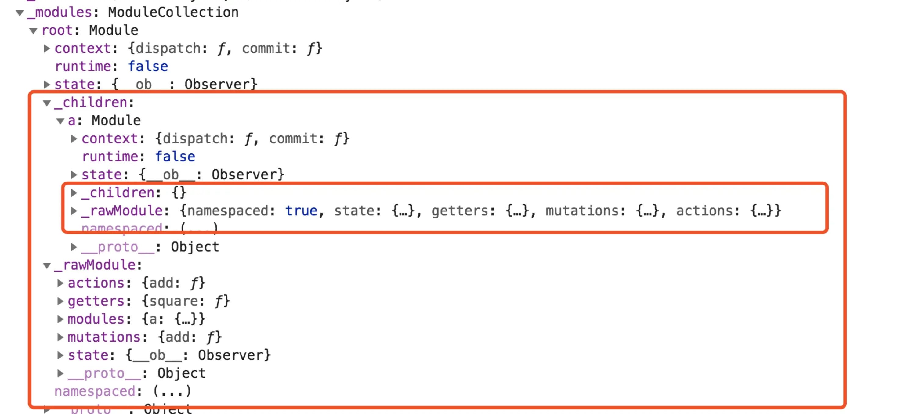 vuex中要构造这样一种数据结构,去存储各个数据项,然后将context中的commit方法重写,将commit(type)代理至namespaceType以实现commit方法的封装,类似的dispatch也是通过这种方式进行封装,而getters则是实现了一个getterProxy,将key代理至store.getters[namespace+key]上,然后在context中的getters替换成该getterProxy,而state则是利用了以上这种数据结构,直接找到对应path的state赋给context.state,这样通过context访问到的都是模块内部的数据了。