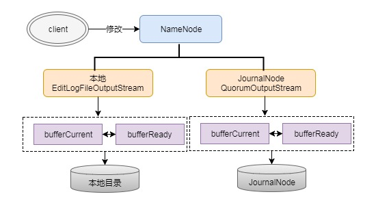 - 在写EditLog时会由两个不同的输出流来控制日志的写过程,分别为:EditLogFileOutputStream(本地输出流)和QuorumOutputStream(JN输出流)。