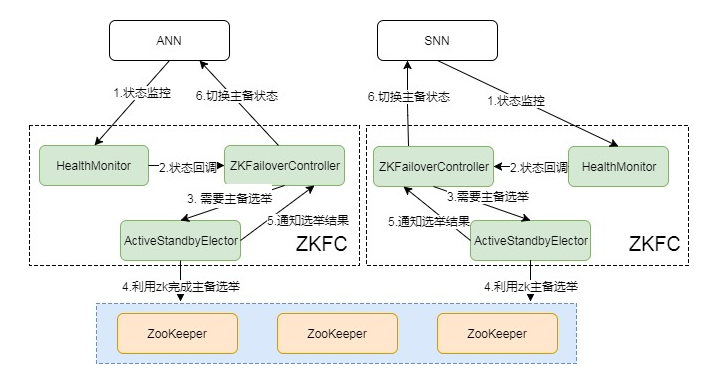 - ActiveStandbyElector: 通知ZK执行主备选举,若ZK完成变更,会回调ZKFailoverController相应方法进行主备状态切换。