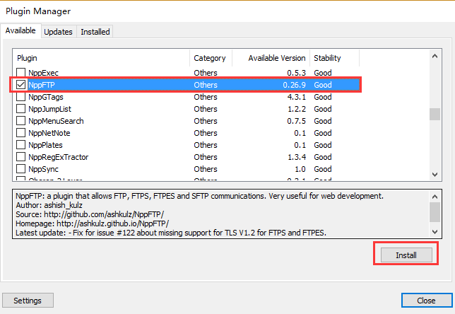 选择 「插件」 --> 「Plugin Manager」 --> 「Show Plugin Manager」,在弹出的窗口中找到 「NppFTP」 ,打上勾并点击 「Install」,之后一路「Yes」 就可以了。