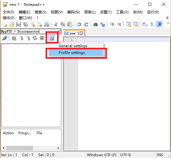 下面就可以通过Notepad++的NppFTP插件来连接虚拟机了。点击NppFTP插件栏的小齿轮选择 「profile settings」: