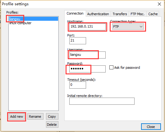 在「profile settings」 里,点击 「add new」 创建一个新的连接,然后右侧填入相应的信息,再点击 「close」 退出。