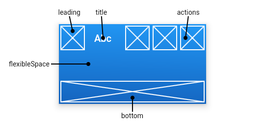 The AppBar displays the toolbar widgets, leading, title, and actions, above the bottom (if any). The bottom is usually used for a TabBar. If a flexibleSpace widget is specified then it is stacked behind the toolbar and the bottom widget. The following diagram shows where each of these slots appears in the toolbar when the writing language is left-to-right (e.g. English):