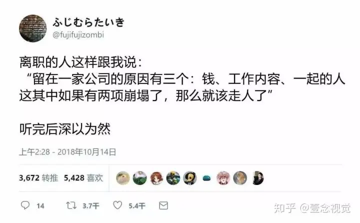 “留在一家公司的原因有三个,钱、工作内容、一起工作的人,这其中如果有两项崩塌了,那么就该走人了。”