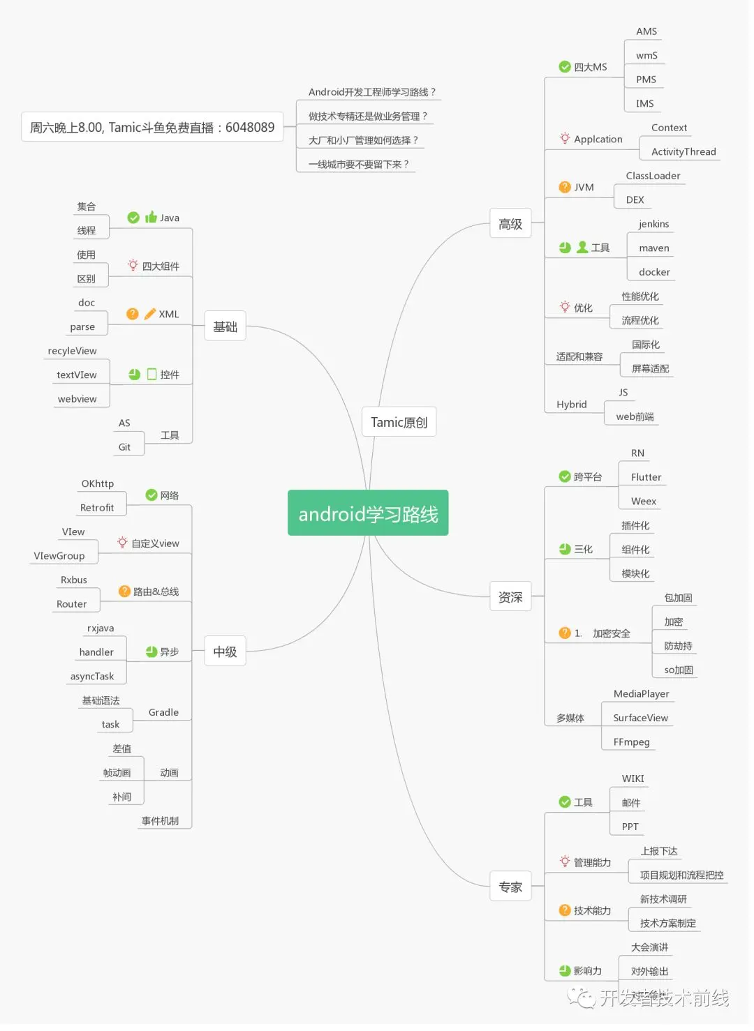 安卓开发也是程序员,但他有自己的技术栈,下面我做了一个大众的精进线路图,读者们可以对照自己的能力去判断下,如果你想升职加薪,就需要对自己短板都补齐,不然就会增加你的中年危机坎的风险。