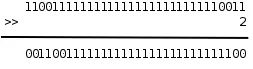 当操作数是无符号数时,右移运算的规则和左移类似,例如0xcffffff3>>2得到0x33fffffc: