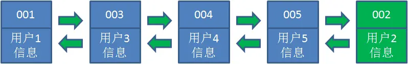 3.接下来,业务方访问用户2,哈希链表中存在用户2的数据,我们怎么做呢?我们把用户2从它的前驱节点和后继节点之间移除,重新插入到链表最右端。这时候,链表中最右端变成了最新访问到的用户2,最左端仍然是最近最少访问的用户1。